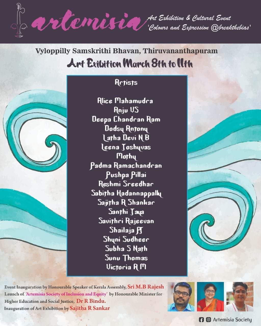 International Women’s Day emphasizes the theme “Break the Bias” which focuses gender equality, equity and inclusion. This show titled “Artemisia”- is a 4 day Art Exhibition by women artists along with cultural events named “Colours and Expressions @breakthebias by Musicians, Poets and Social enthusiasts. The four day event was inaugurated by Honourable Speaker of Kerala Assembly, Sr. M B Rajesh and the Art Exbition was inaugurated by renowned artist Sajitha R Sanker.